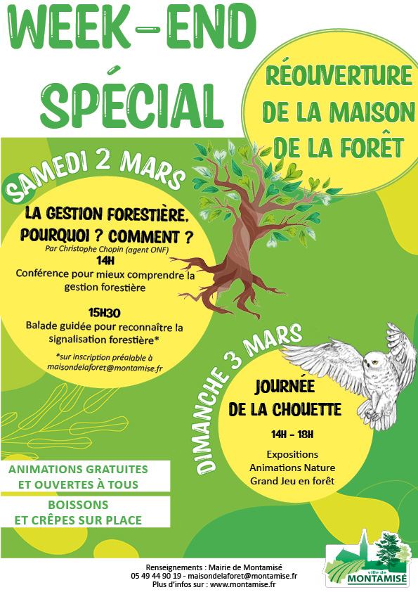 Dès le samedi 2 mars, la Maison de la Forêt rouvre ses portes pour une nouvelle saison. Pour l’occasion, tout le week-end sera animé, découvrez le programme ci-contre :