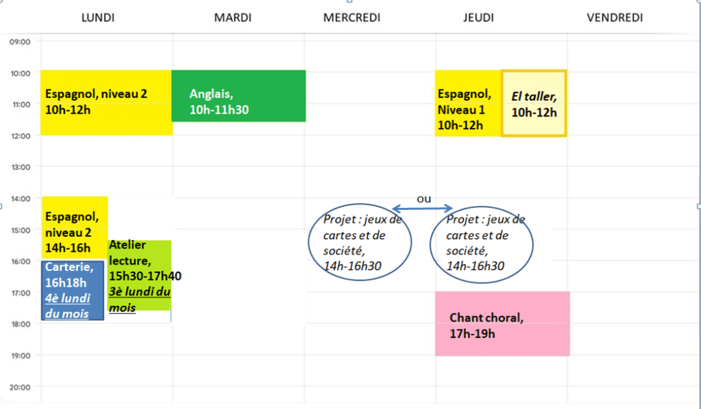 Les activités au local du club, 42 rue du Rondy, Poitiers, horaires 2024-2025